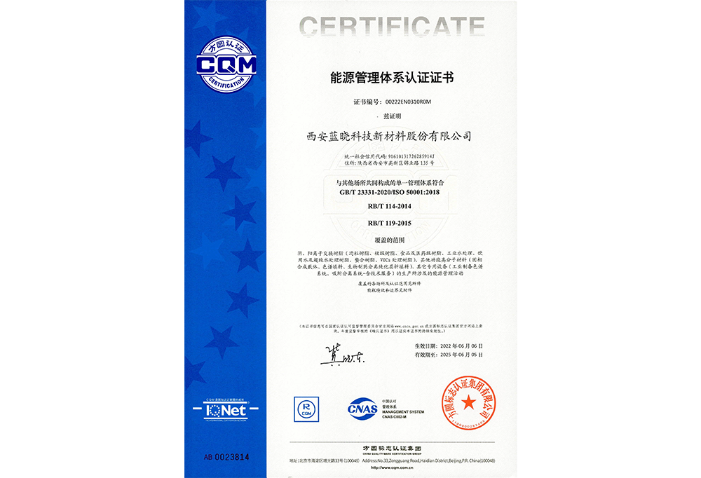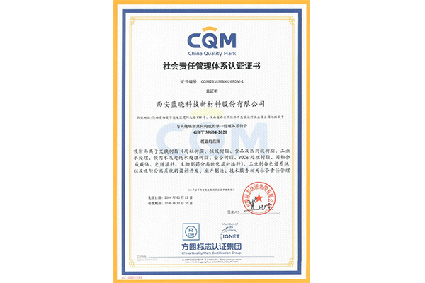 藍曉科技在核心材料創(chuàng)新、新興應(yīng)用領(lǐng)域拓展、專業(yè)化銷售與服務(wù)等方面具有綜合的技術(shù)優(yōu)勢,核心技術(shù)全部為自主知識產(chǎn)權(quán),擁有中國專利59 項,其中發(fā)明專利50項,以及國際專利授權(quán)6項。2次榮獲國家科技進步二等獎,完成科技部創(chuàng)新基金2項,獲得國家重點新產(chǎn)品3項。藍曉科技先后通過GB/T 19001-2016/ISO 9001:2015 質(zhì)量管理體系認證和GB/T 24001-2016/ISO14001:2015 環(huán)境管理體系認證、GB/T 45001-2020/ISO 45001:2018職業(yè)健康安全管理體系認證、GB/T 23331-2020/ISO 50001:2018能源管理體系認證、GB/T23001-2017信息化和工業(yè)化融合管理體系,并擁有WQA金印、Kosher、FDA注冊、CE、REACH等國際資質(zhì),確保向客戶提供優(yōu)質(zhì)穩(wěn)定的產(chǎn)品。公司生產(chǎn)的吸附分離材料包括30多個系列100多個品種,廣泛用于食品、制藥、植物提取、離子膜燒堿、環(huán)保、化工催化、濕法冶金、水處理等工業(yè)領(lǐng)域,市場覆蓋全球100多個國家。